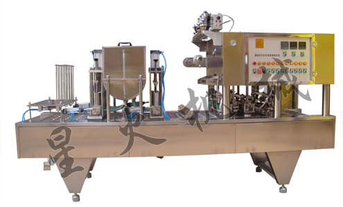 綠豆沙封口機適用于各種八寶粥、綠豆沙等產品的生產,能自動完成塑料碗的自動落碗、充填米、充填蓮子等、水灌裝、紫外線消菌、光電定位、兩道熱封、自動對芯剪切及廢膜回收等功能。
