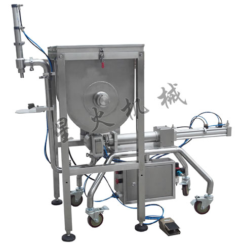 該辣椒醬灌裝機專門針對油料分離較快,立式攪拌不能解決的的顆粒醬類物料的灌裝,技術先進、性能穩定,采用光電自控系統,獨特的活塞式灌裝形式,既可以連續灌裝,也可以自由灌裝機。采用臥式攪拌結構,保證了醬和油的充分混合,具有結構簡便合理,操作簡單易懂、精確度高等特點,灌裝閥由氣動閥控制,灌裝精度更高,灌裝量和灌裝速度均可任意調節,灌裝悶頭采用防拉絲及升降灌裝裝置,物料接觸部分均采用316L不銹鋼材料制成,符合GMP要求。