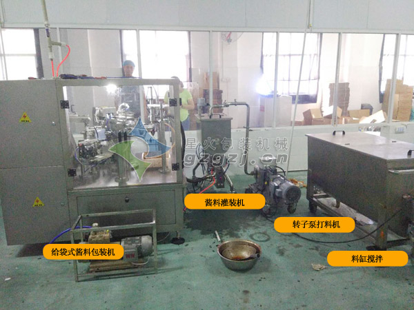 甜辣醬包裝機成不少調味醬生產企業標配 甜辣醬、刷刷醬等幾乎都成為燒烤、火鍋、西餐的標配。從生產企業來看,多數企業采用自動包裝機實現了調味醬生產的自動化、智能化。今天,以我們近期的客戶-徐州青創食品為例,帶您了解下有哪些設備在背后推動調味醬的智能化生產 徐州青創食品有限公司是一家致力于火鍋底料及蘸料的生產企業;對于其產品的包裝過程主要要求物料均勻、包裝密封性好、圖案完整;我們在甜辣醬包裝機前端為其配置了單獨的料缸攪拌機,這是保證大顆粒粘稠物料不沉淀的第一步;其后通過轉子泵打料機交由醬料灌裝機再次攪拌;給袋式醬料包裝機作為最后的包裝工序也是最關鍵的,它的封口效果直接決定了調味醬的保質期;為此,我們標配有光電跟蹤設置,對包裝袋的封口位置、溫度等進行監控和調節;